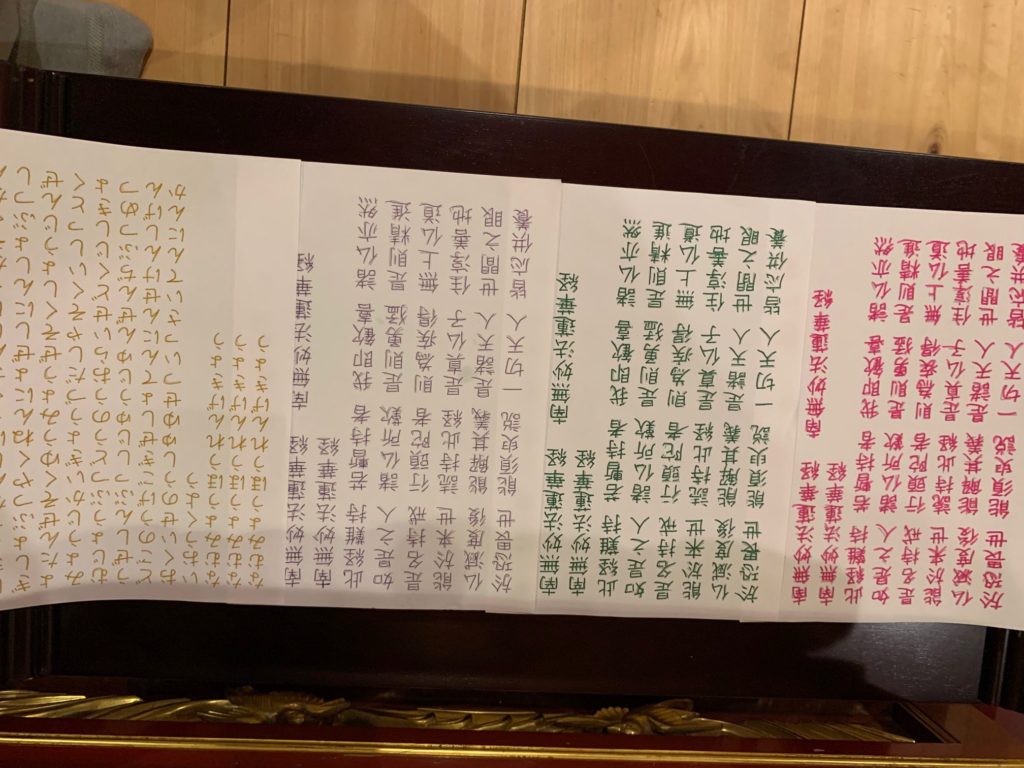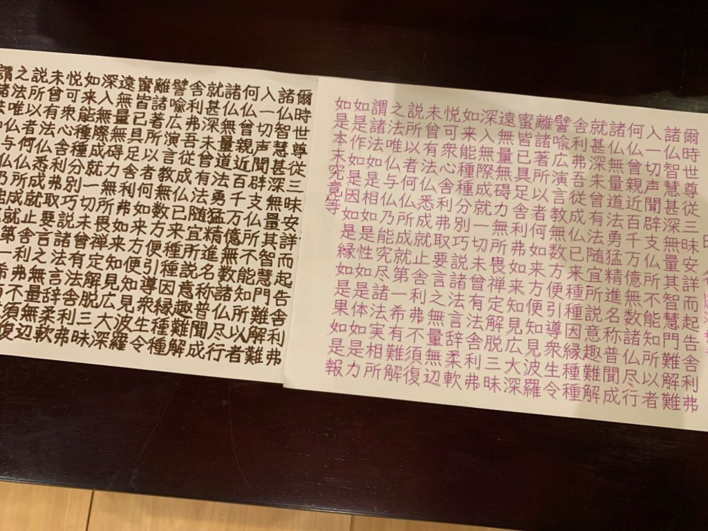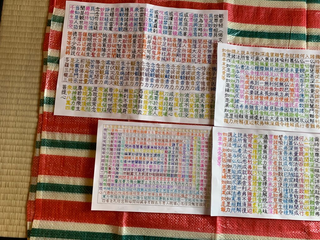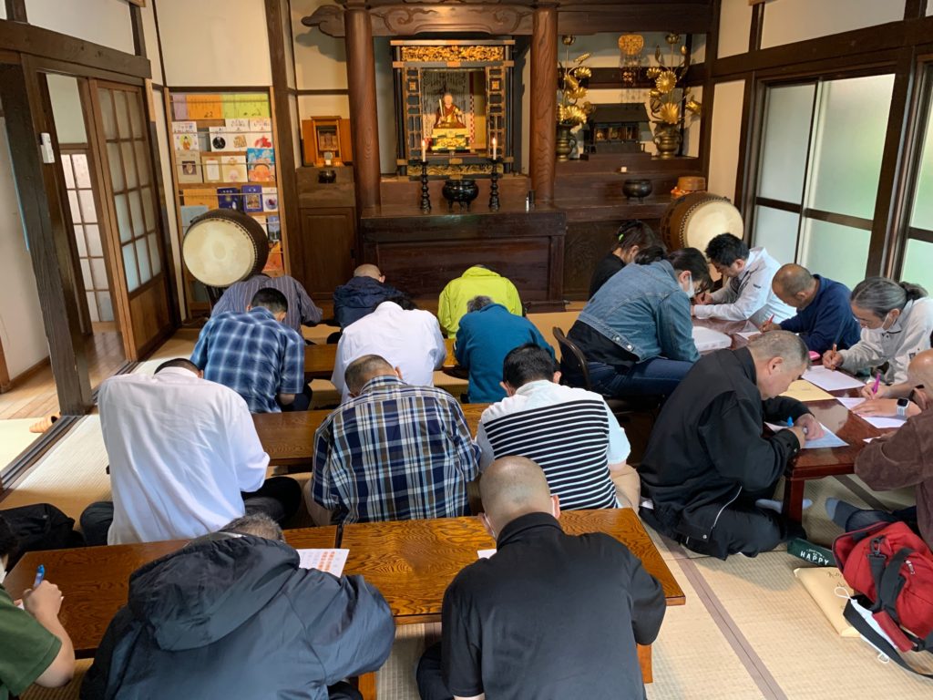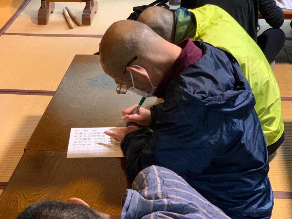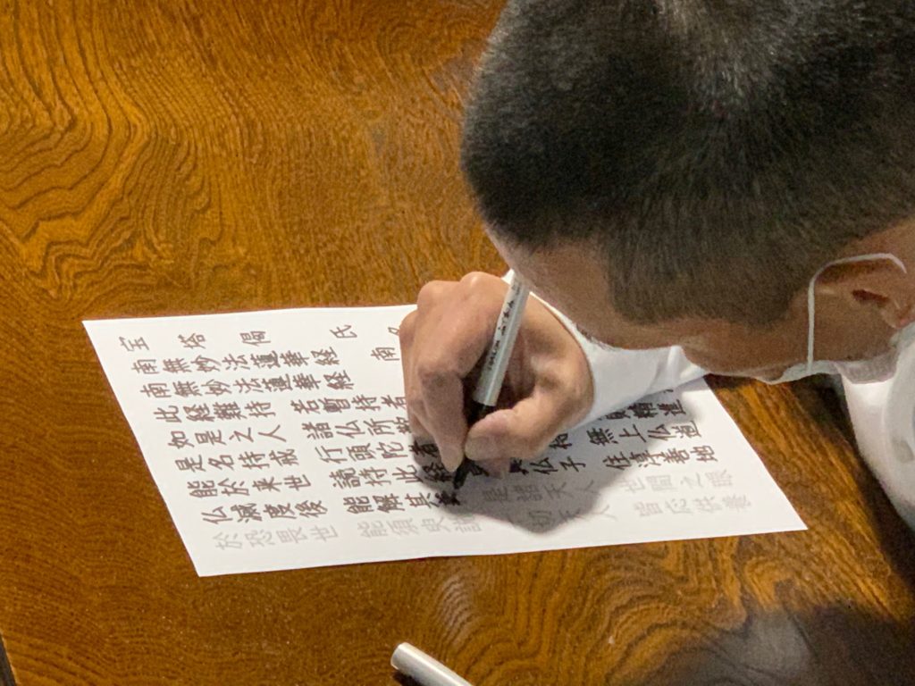 写経するお経は集中できるように短めのものを職員さんが用意してくださり、方便品、宝塔偈、観音偈を書かれていました。時間があれば数色使ってきれいに書けるようですが時間内に全員が終えることのできるよう昨日は単色で書かれていました。
